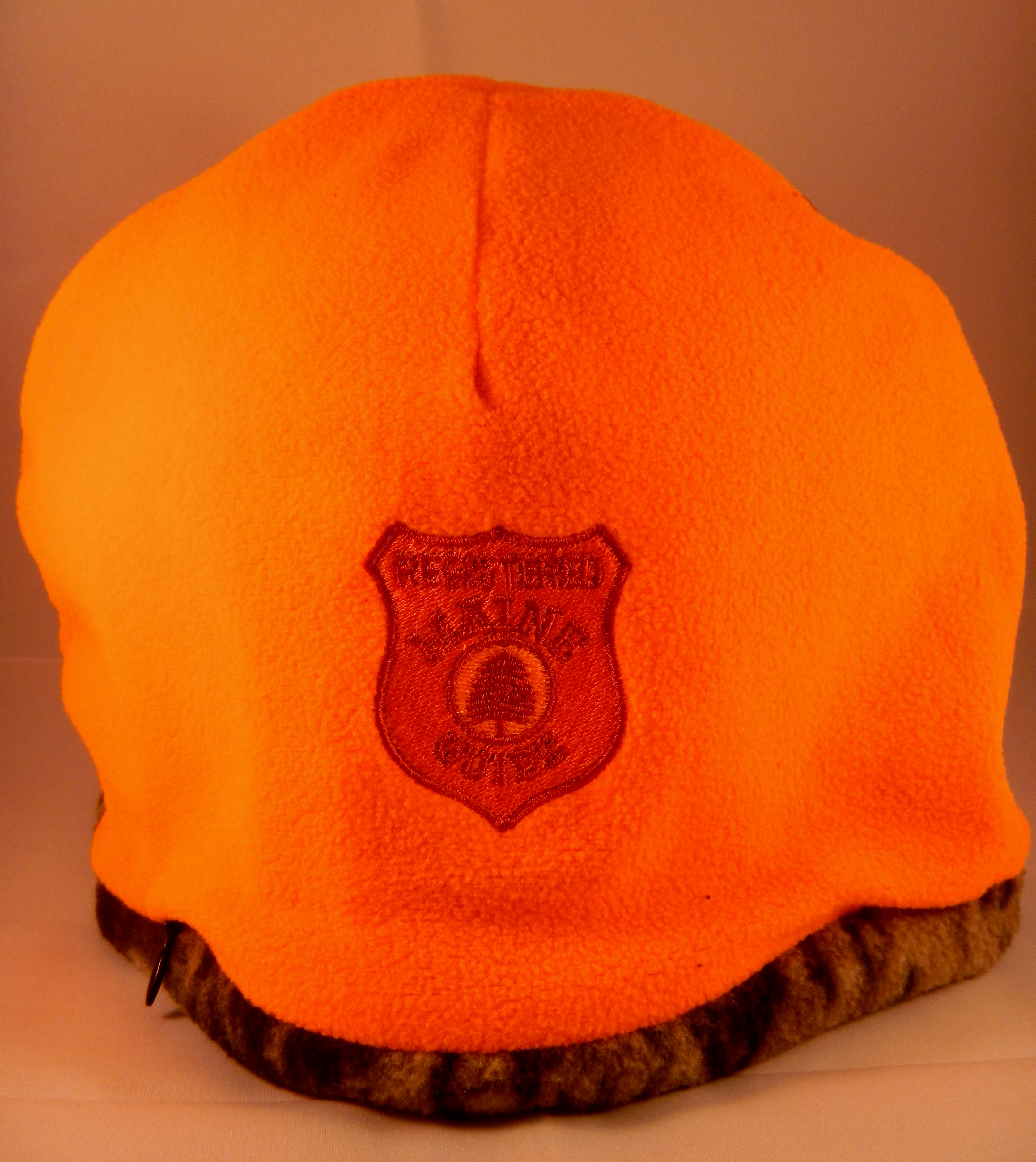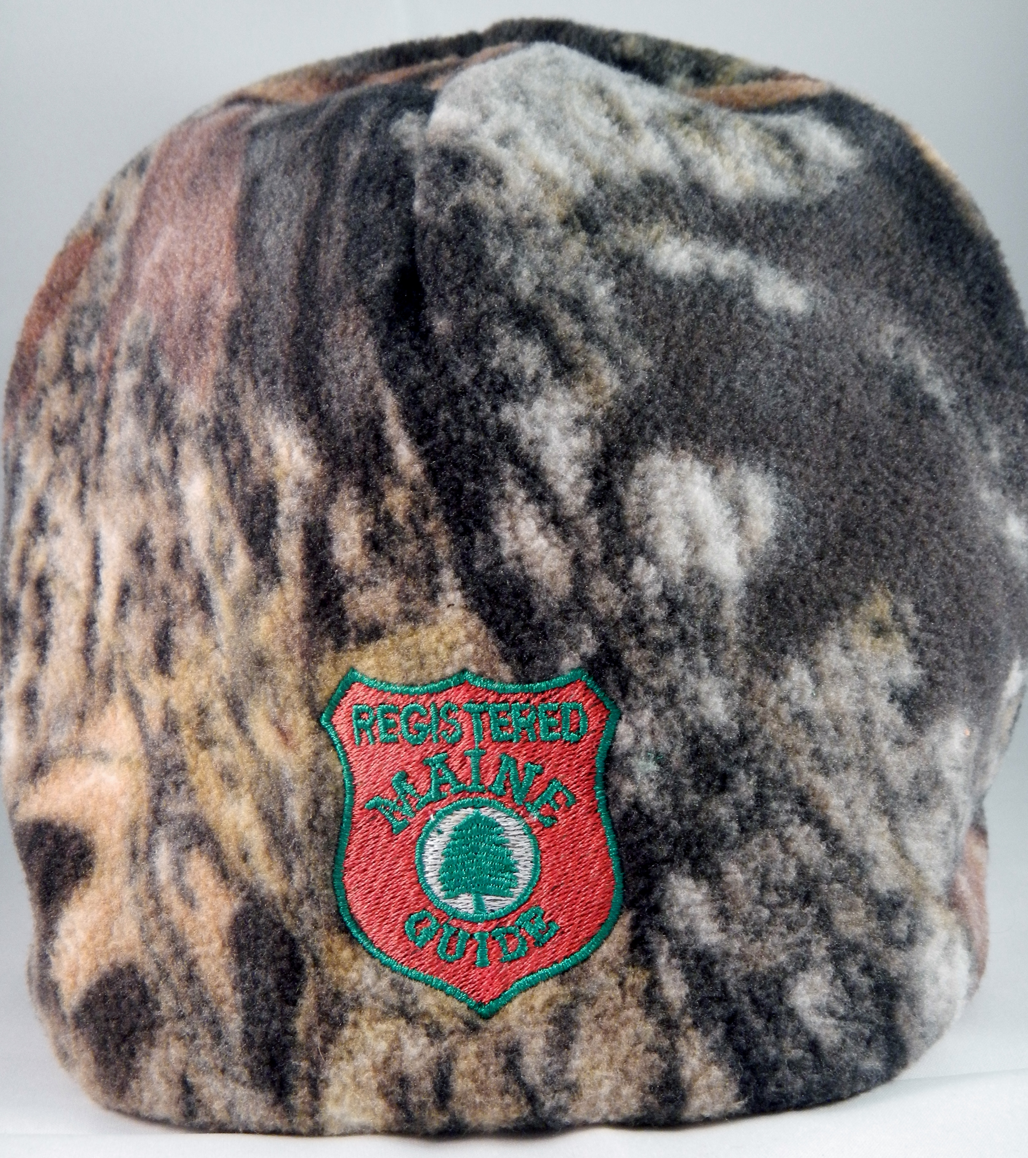 A two layer polarfleece beanie that is Mossy Oak on one side and Blaze Orange on the other. On the Mossy Oak side, the red/green Registered Maine Guide or Master Maine Guide patch is embroidered. On the Blaze Orange side the patch is done in blaze orange.